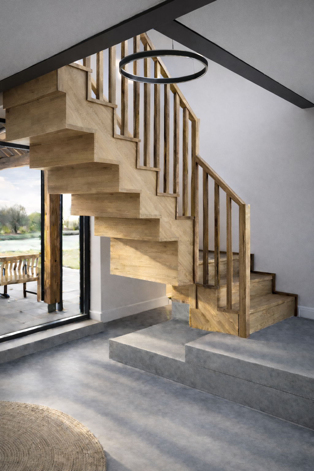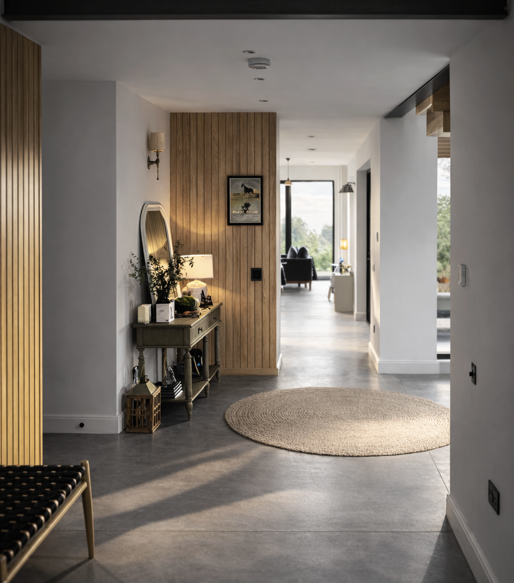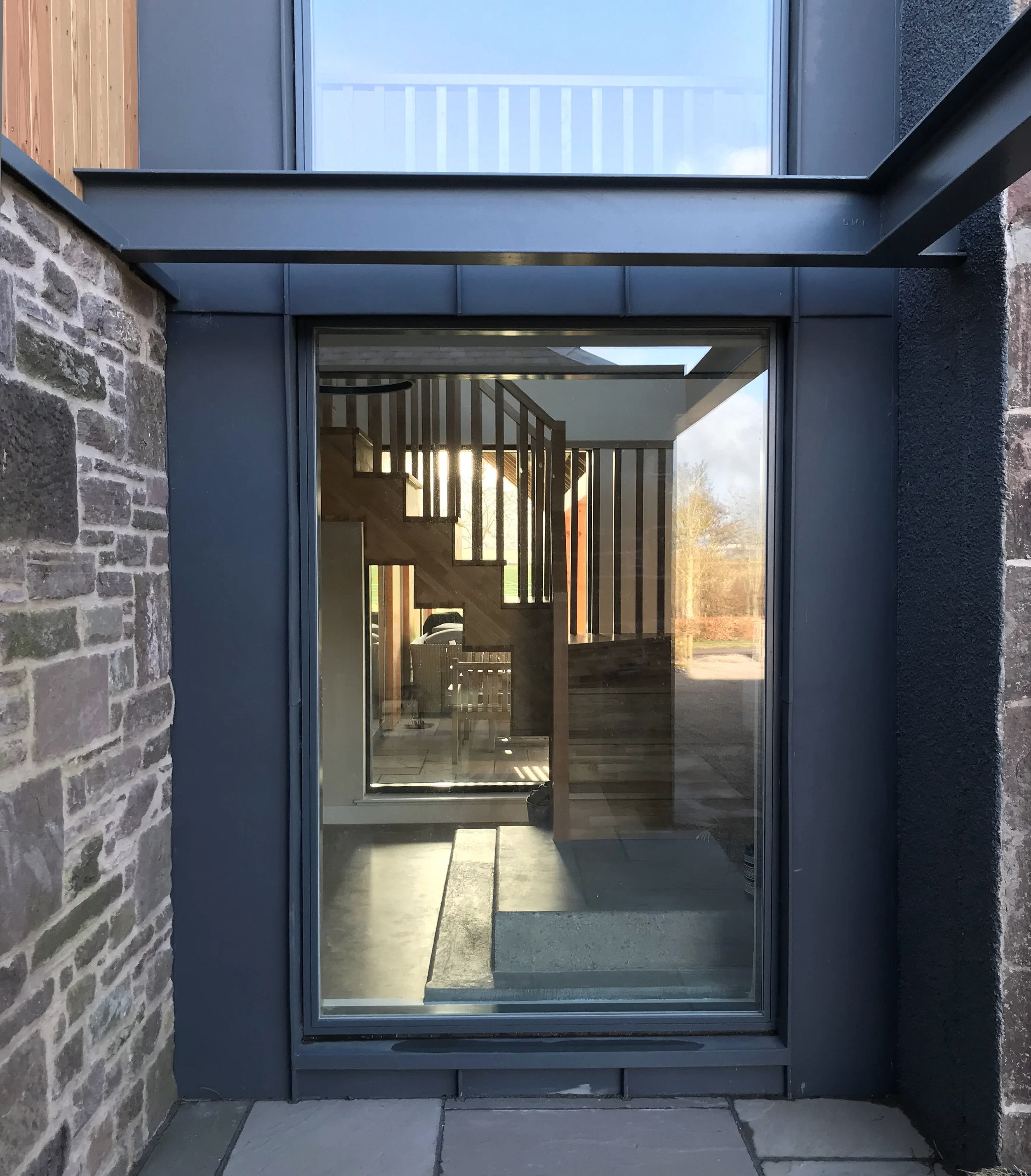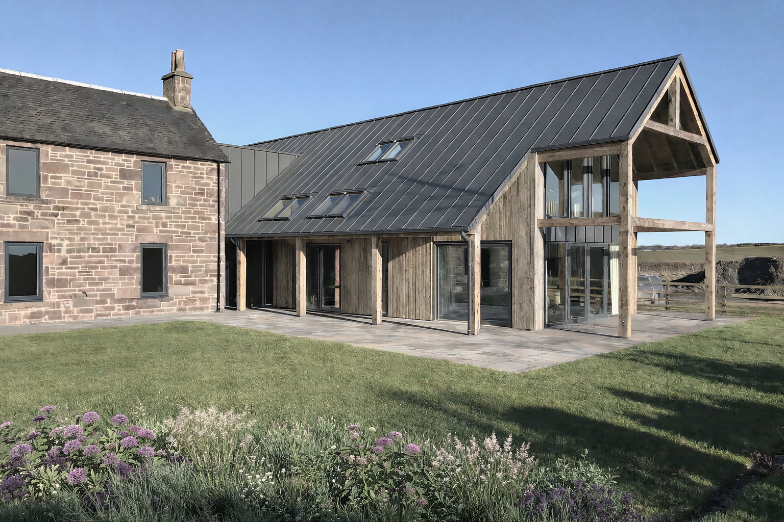 Key to solving the space problem was positioning a new entrance which would link the existing farmhouse, existing barn and a new extension. This allowed old and new elements to connect seamlessly and function as a single, unified home.